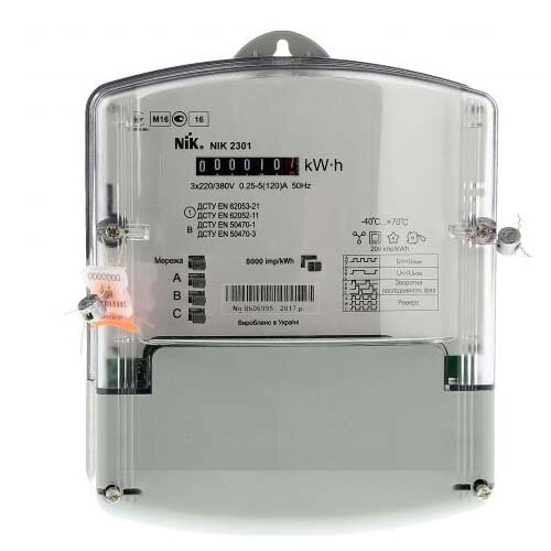 Лічильник НИК 2301 АР3 (1,0 3*220/380В 5(120) А) - основні переваги: ??підвищений ступінь захисту від впливу постійних та змінних магнітних полів (СОУ-Н МПЕ 40.1.35.110:2005); технологічний запас за класом точності не менше ніж 50%; мале власне енергоспоживання; прозорий кожух; можливість встановлення прозорої клемної кришки; зварні шви корпусу; можливість індикації впливу магнітного поля з величиною індукції понад 100 мТл (залежно від виконання); захист від розкрадання електроенергії: індикація неправильних підключень, зворотного напрямку струму, занижених та завищених фазних напруг.