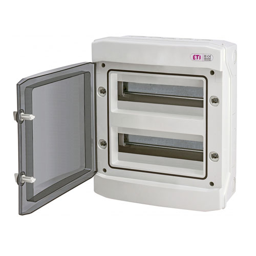 Щит пласт. зовнішній ECH 24PT (24мод.) IP65 - пластиковий розподільний щит на 24 модулі для зовнішнього монтування. При встановленні поза спеціальним приміщенням дозволяє зберегти естетику інтер'єру. Для монтажу на задній стінці щита встановлюється металевий профіль (DIN-рейка). Для захисту від випадкового дотику до клем модулів оснащений прозорими пластиковими дверцятами, що дозволяє не відкриваючи її бачити положення вимикачів.