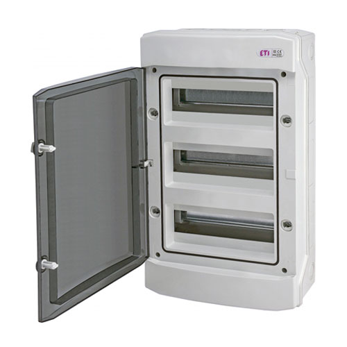 Щит пласт. зовнішній ECH 36PT (36мод.) IP65 - пластиковий розподільний щит на 36 модулів для зовнішнього монтування. При встановленні поза спеціальним приміщенням дозволяє зберегти естетику інтер'єру. Для монтажу на задній стінці щита встановлюється металевий профіль (DIN-рейка). Для захисту від випадкового дотику до клем модулів оснащений прозорими пластиковими дверцятами, що дозволяє не відкриваючи її бачити положення вимикачів.