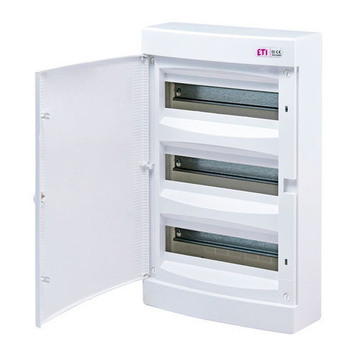 Щит зовн. розподільчий ECT 36 PO (36мод., білі дверці) (3x12мод.) - розподільний щит на 36 модулів для зовнішнього монтування. При встановленні поза спеціальним приміщенням дозволяє зберегти естетику інтер'єру. Для монтажу на задній стінці щита встановлюється металевий профіль (DIN-рейка).