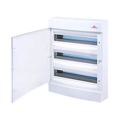 Щит зовн. розподільчий ECT 3x18 PO (54мод., білі дверці) - розподільний щит на 54 модулі для зовнішнього монтування. При встановленні поза спеціальним приміщенням дозволяє зберегти естетику інтер'єру. Для монтажу на задній стінці щита встановлюється металевий профіль (DIN-рейка).