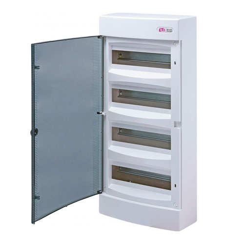 Щит зовн. розподільчий ECT 48 PT (48мод.,проз.дверці) - розподільний щит на 48 модулів для зовнішнього монтування. При встановленні поза спеціальним приміщенням дозволяє зберегти естетику інтер'єру. Для монтажу на задній стінці щита встановлюється металевий профіль (DIN-рейка). Для захисту від випадкового дотику до клем модулів оснащений прозорими пластиковими дверцятами, що дозволяє не відкриваючи її бачити положення вимикачів.