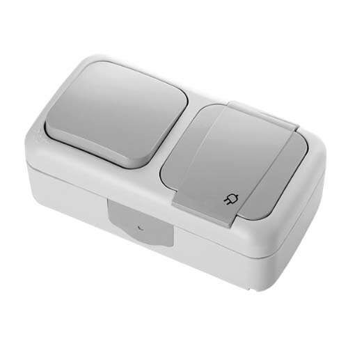 Вимикач 1 + Розетка із заземл. сірий VI-KO - Зовнішня серія фурнітури Viko «Palmiye» включає прості та прохідні вимикачі, двоклавішні вимикачі, вимикачі з підсвічуванням, розетки з кришкою і кнопкою дзвінка. Призначені для встановлення зовні, тому мають ступінь захисту IP54. Серед переваг цієї серії також зручний монтаж/демонтаж, гнучка система ущільнення та швидка система з'єднання.