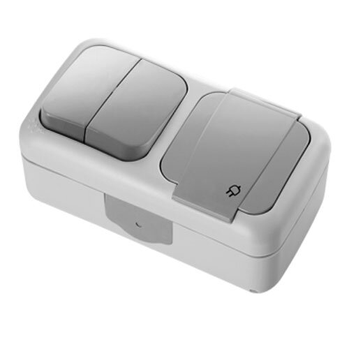 Вимикач 2 + Розетка із заземл. сірий VI-KO - Зовнішня серія фурнітури Viko «Palmiye» включає прості та прохідні вимикачі, двоклавішні вимикачі, вимикачі з підсвічуванням, розетки з кришкою і кнопкою дзвінка. Призначені для встановлення зовні, тому мають ступінь захисту IP54. Серед переваг цієї серії також зручний монтаж/демонтаж, гнучка система ущільнення та швидка система з'єднання.