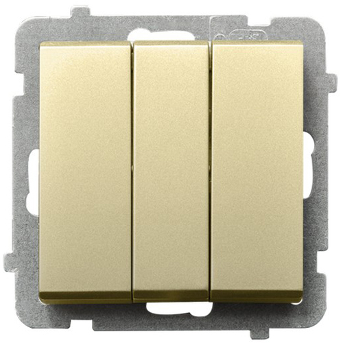 Вимикач 3-й без рамки Sonata Золото - колекція SONATA відповідає найвищим технологічним стандартам, а також є комплексним і функціональним дизайнерським рішенням. За основу даної модульної серії прийнято виразну і просту форму квадрата.